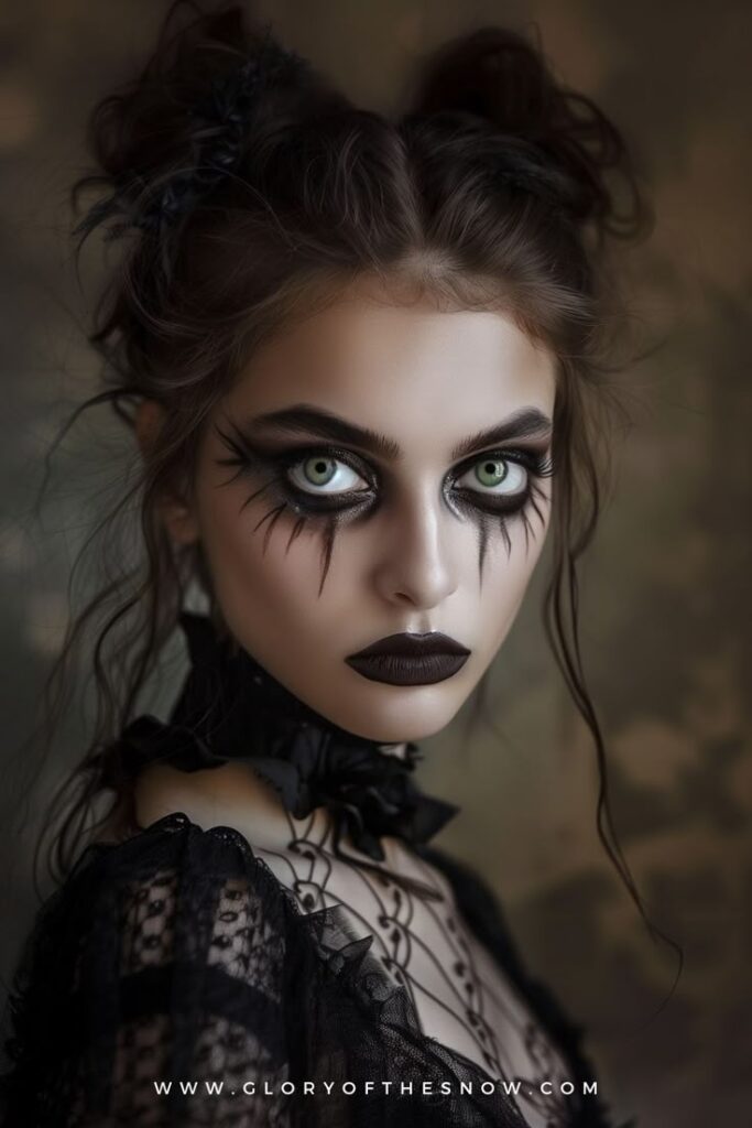 Là où les maquillages d’Halloween misent souvent sur la peur brute, la poupée gothique joue sur la dualité : beauté et mystère.